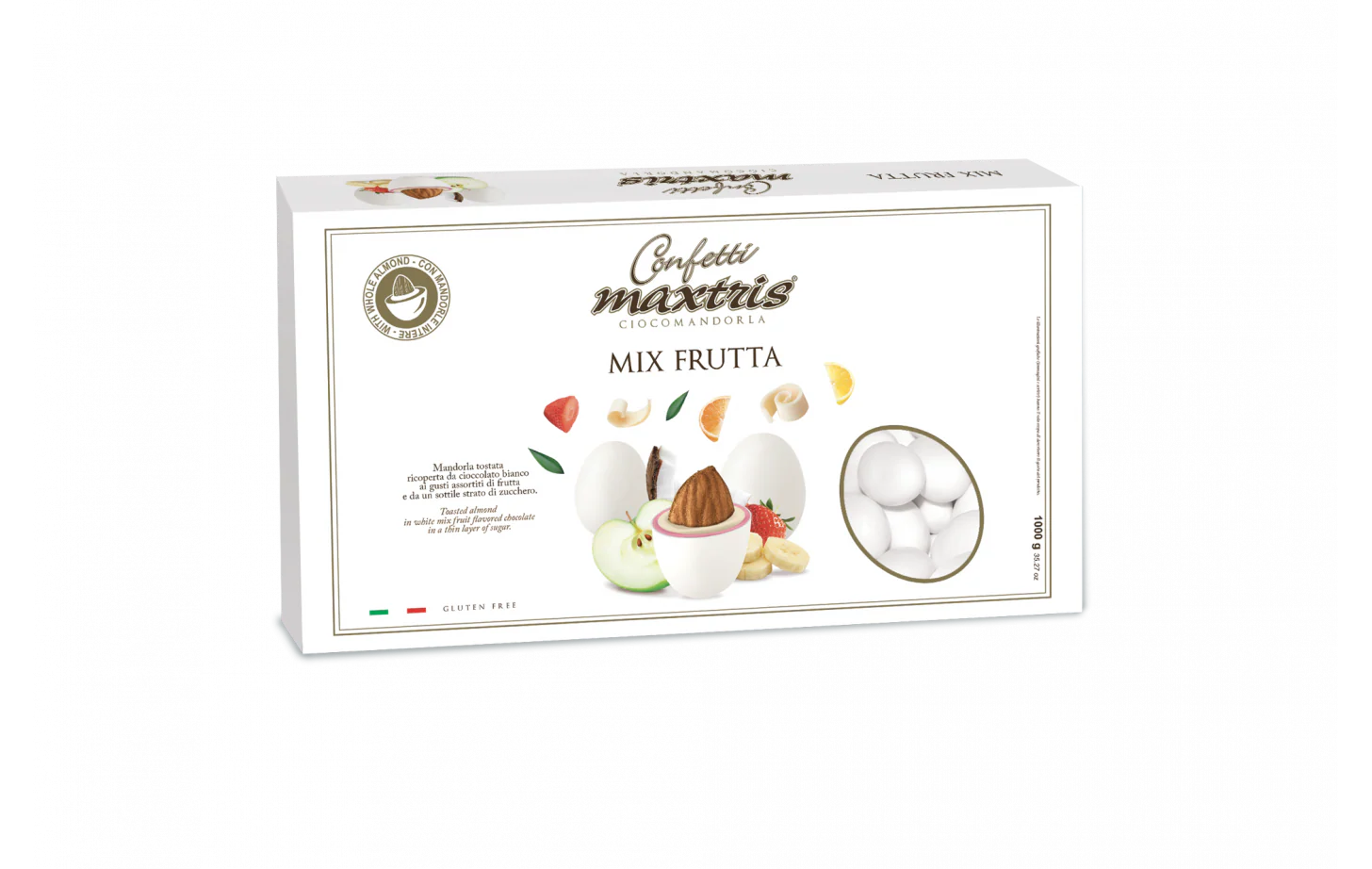 MAXTRIS CONFETTI ALLA FRUTTA 1 KG CON MANDORLA TOSTATA RICOPERTA DI CIOCCOLATO BIANCO MISTO FRUTTA.