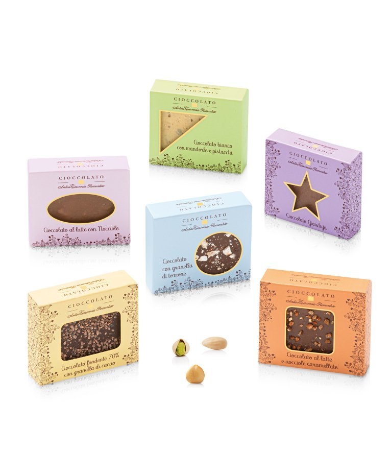 Deliziose quadrotte da 40g di cioccolato tagliate a filo, disponibili in sei diverse varianti: quadrotta di cioccolato al latte con nocciole, quadrotta di cioccolato con granella di torrone, quadrotta di cioccolato al latte e nocciole caramellate, quadrotta Gianduja, quadrotta di cioccolato bianco con mandorle e pistacchi, quadrotta di cioccolato fondente al 70% con granella di cacao. Ogni confezione racchiude la specularità del prodotto. CHIEDI IL GUSTO NELLE NOTE O COMPRALE TUTTE SONO 6 SPECIALITA'.